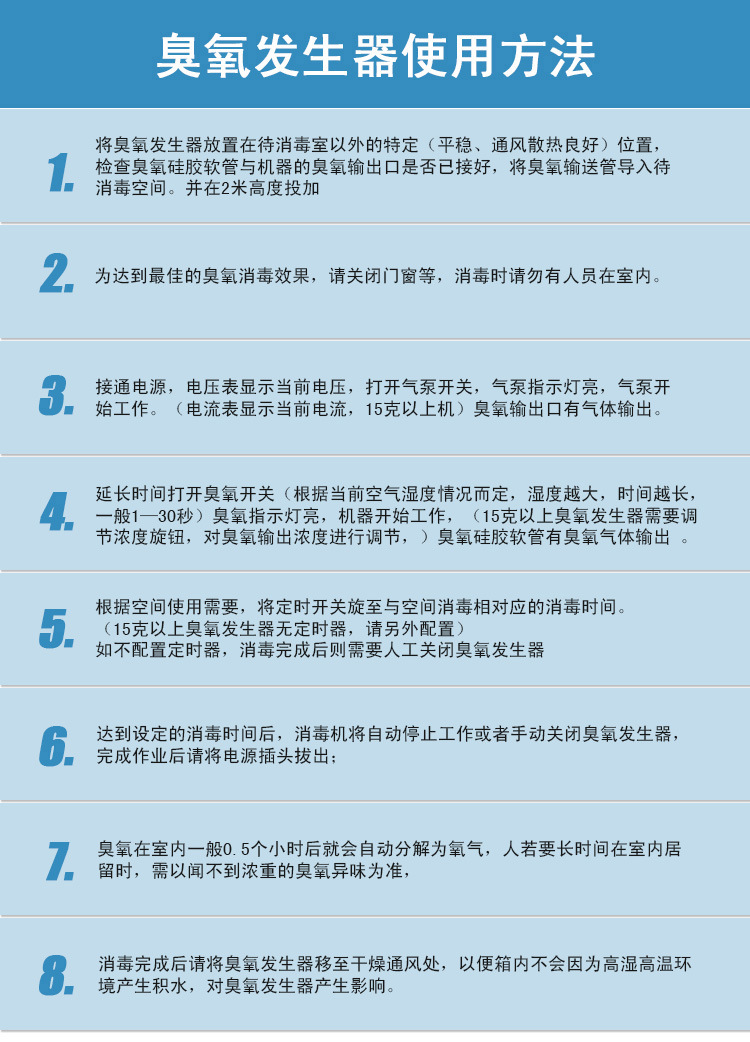 廣州佳環(huán)電器科技有限公司是專業(yè)從事臭氧系列設備的研發(fā)、生產(chǎn)及銷售為一體的臭氧發(fā)生器廠家。公司成立于2007年,經(jīng)過多年發(fā)展,現(xiàn)已成為臭氧行業(yè)的領(lǐng)先企業(yè),以雄厚的技術(shù)實力和豐富的臭氧行業(yè)經(jīng)驗為依托,不斷的開發(fā)出新型臭氧產(chǎn)品面向市場。我們以臭氧發(fā)生器技術(shù)為核心,制造出多種規(guī)格臭氧產(chǎn)品,包括空氣源臭氧消毒機、氧氣源高濃度臭氧一體機、汽車消毒機、高濃度臭氧水一體機、臭氧消毒柜、畜禽養(yǎng)殖儀等大中小臭氧系列產(chǎn)品。 專業(yè)服務于食品殺菌,食品安全,制藥殺菌,泳池水消毒,海洋館,污水脫色,降COD,BOD,化工氧化,食用菌栽培滅菌技術(shù),飲水安全、環(huán)保等十幾個行業(yè)的各種需求。佳環(huán)電器科技臭氧技術(shù),臭氧發(fā)生器專用制氧技術(shù),臭氧發(fā)生器水氣混合技術(shù),臭氧機檢測技術(shù),臭氧機水處理技術(shù),臭氧行業(yè)應用技術(shù)等領(lǐng)域,在國內(nèi)均處于領(lǐng)先地位。我公司臭氧設備以技術(shù)先進,性價比優(yōu)勢而在行業(yè)上處于有力競爭地位。 自創(chuàng)業(yè)以來,公司不論是對社會、對客戶、對員工皆秉持誠意、正心、篤實、守法的態(tài)度來經(jīng)營企業(yè),建立起一貫良好的企業(yè)形象。誠信是寶貴的無形資產(chǎn),是立業(yè)之本,以誠心為 已、服務為先、顧客為尊、想顧客之所想。 佳環(huán)臭氧發(fā)生器,臭氧消毒三大好處: 佳環(huán)臭氧發(fā)生器,運用范圍: 各區(qū)域使用介紹: 企業(yè)、學校等餐館臭氧應用: 由于人員較多,一旦出現(xiàn)事故就非常嚴重。而且也確實許多地方和學校發(fā)生了這些群體性的食物中毒和腸道傳染病等事件。這一系列事件的發(fā)生,嚴重影響了員工和學生的身心健康及正常秩序,也暴露對食品安全管理工作存在的漏洞、隱患和忽視。因而需要對食堂的管理和操作進行規(guī)范,同時需要對食品原材、廚具、餐具及食堂進行消毒,而傳統(tǒng)的消毒方法容易造成二次污染和殘留,因而越來越多的地方采用臭氧消毒殺菌。 要保證這些集體食堂的食品安全,可針對以下方面進行操作: 1、對食堂空間的殺菌消毒。 2、對食堂的工作服、廚具、餐具、原材等的殺菌消毒。 3、對食堂使用的水殺菌消毒等。 而通過臭氧發(fā)生器能很好的滿足這些要求,臭氧發(fā)生器具有以下有別于傳統(tǒng)殺菌方法的優(yōu)點。 1、環(huán)保潔凈,無二次污染,臭氧消毒產(chǎn)物無害且自身不對環(huán)境產(chǎn)生污染,在環(huán)境中能自然分解成氧氣,因而是一種潔凈的凈化技術(shù)。 2、高效迅速,短時間見效,能有效殺滅各種微生物,趕走各類蚊蟲鼠蟻,有限扼制傳播途徑和傳染源。 3、適應性強,隨地即可用,就地取材產(chǎn)生高濃度臭氧且操作方便。 食品行業(yè)臭氧應用: 臭氧是強氧化劑,能有效氧化各類物質(zhì),殺滅各類微生物。還能脫色、去臭,對于其他方法難分解的物質(zhì)也變成容易分解的物質(zhì)。因此,在生產(chǎn)生活的用水和空間凈化處理方面,臭氧的作用顯著、使用廣泛,能應用于處理各類原水、廢水等,保障生產(chǎn)生活的正常進行。 臭氧的滅菌機制和滅菌特性 臭氧能作用于細菌和病毒等的細胞壁和細胞膜,作用于其脂質(zhì)(類脂化合物)的雙鍵,將其氧化斷鏈從而將細胞膜、細胞質(zhì)被破壞,從而達到滅菌的效果。 化妝品容器的消毒滅菌: ? 對管道容器做消毒滅菌的優(yōu)點非常明顯,臭氧發(fā)生器可以流動使用,對不同的罐進行消毒,每個生產(chǎn)單元在每次換料前,都可以及時得到消毒,使用效率很高,很方便,不要用那么多的酒精,不要用氮氣,也不要用高壓蒸氣。所以在化妝品廠、食品廠得到了廣泛的推廣。 醫(yī)療衛(wèi)生領(lǐng)域:醫(yī)院是治療疾病的地方,但是由于到醫(yī)院就診的人很大部分是危重患者,其炎癥正處于高峰時期,來自病人身上的有害病菌極易散發(fā)于空氣中。因此,醫(yī)院又是容易感染疾病的場所?,F(xiàn)在,由于到醫(yī)院就診引起交叉感染的事已司空見慣。醫(yī)院手術(shù)和護理操作前大夫或護士的雙手及手術(shù)器具的消毒問題也是亟待解決的課題之一。具有高效、迅速殺菌作用的臭氧在醫(yī)院環(huán)境消毒、術(shù)前消毒等方面大有用武之地。比如,日本科學家就研究過用于醫(yī)院的臭氧水消毒法。據(jù)其研究結(jié)果,用臭氧水對醫(yī)院手術(shù)前醫(yī)生、護士的雙手消毒,可殺死所有細菌,不僅時間極短,而且其消毒效果也是其他碘類消毒劑無法比擬的。傳統(tǒng)進行同樣的消毒操作至少需要10分鐘。在醫(yī)院中最易引起感染的黃色葡萄球菌和綠膿桿菌等在臭氧水中只需5秒鐘即可全部殺死,其殺菌力遠遠超過酒精和氯。而且臭氧水具有可靠的安全性,經(jīng)常使用不會傷及肌膚,即使誤喝也不會中毒。 治療臭氧應用: 如俄羅斯研究出一種特殊的液壓液來治愈傷口,其基本方法就是在高壓下用霧狀富含臭氧的生理溶液沖洗傷口,水流就象手術(shù)刀一樣將傷口中的膿血、壞死組織及細菌分解物清除,同時殺死傷口表面的致病微生物。然后變換"臭氧刀"的結(jié)構(gòu),繼續(xù)增大液體的壓力,使臭氧化的溶液滲進發(fā)炎組織幾毫米至3厘米深,并