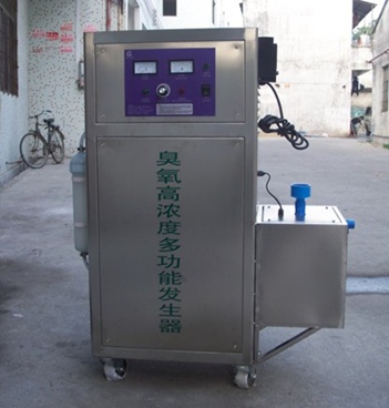 1. 直接吹送法:適用于容積較小的車間 1.1將機(jī)器安裝在消毒間外通風(fēng)干燥的地方。 1.2連接臭氧硅膠輸送管,管道出氣口應(yīng)置于車間內(nèi)2/3以上的高度,以便于臭氧彌漫于整個(gè)消毒間。20克以下為風(fēng)冷臭氧發(fā)生器,通電直接使用;20克以上為風(fēng)冷+水冷臭氧發(fā)生器,需要外接冷卻水。 外接冷卻水的方法有兩種:直接連接自來水或用水箱+循環(huán)泵做一個(gè)循環(huán)利用的 水系統(tǒng)。下圖為外接冷卻水箱的40克臭氧發(fā)生器: