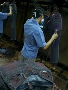 三:臭氧氧化與傳統(tǒng)方法的優(yōu)缺點(diǎn)比較 1. 用次氯酸鈉(婆梅度為18度)經(jīng)濟(jì);不好控制,有傷布的纖維。健康危害:經(jīng)常用手接觸本品的工人,手掌大量出汗,指甲變薄,毛發(fā)脫落。本品有致敏作用。本品放出的氯氣有可能引起中毒。具腐蝕性,可致人體灼傷,具致敏性。 2. 用亞氯酸鈉和硫酸在加次氯酸鈉。價(jià)格比上一種高點(diǎn)。但比上一種好點(diǎn)。不傷布的纖維。亞氯酸鈉有強(qiáng)氧化性。在175℃時(shí)即分解而發(fā)熱,與可燃物質(zhì)接觸,即起猛烈爆炸,須注意安全。硫酸對(duì)環(huán)境有危害,對(duì)水體和土壤可造成酸性污染。具強(qiáng)腐蝕性、強(qiáng)刺激性,可致人體灼傷。 3. 高錳酸鉀、過(guò)醋酸和還原漂白方式 關(guān)于牛仔布漂白,除了用次氯酸鈉和亞氯酸鈉外,還可以用高錳酸鉀、過(guò)醋酸和還原漂白方式,具體需要根據(jù)牛仔布所用染料類(lèi)型來(lái)選擇,傳統(tǒng)牛仔為還原淀籃染料,也有用硫化染料或直接染料代替,也有采用活性染料代替的,故此,需要根據(jù)具體情況考慮。 4. 臭氧氧化的優(yōu)點(diǎn) a) 無(wú)污染,臭氧為純凈物。在常溫下,易分解,生成氧氣和氧原子 b) 臭氧的氧化能力極強(qiáng)。 c) 運(yùn)行成本低 四:手工處理 1.手擦 a) 在洗水前,通過(guò)使用砂輪滾動(dòng)摩擦而使布面染料褪色,手擦的地方通常是脾位和臀位,人為的機(jī)械褪色,讓牛褲在洗水后顯得自然地懷舊和泛白 b) 噴沙和手擦效果接近,但對(duì)布紋的效果有差別。噴沙后布紋模糊,沉底,而手擦后布紋清晰凸顯