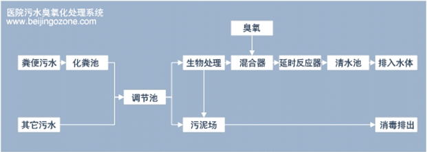 近來發(fā)展起來的臭氧水處理技術(shù),在醫(yī)院污水處理工程上被廣泛應(yīng)用,收到了極好的效果,這是因為臭氧比氯、漂白粉、二氧化氯具有更強的氧化能力,可以比氯快600-3000倍的速度殺死包括氯不能徹底殺死的所有細菌、病毒等;可將某些重金屬離子Pb、Hg等氧化沉淀達到分離的目的;另外臭氧還可降低生化耗氧量(BOD)和化學(xué)耗氧量(COD)、去除亞硝酸鹽和脫色、除臭等。經(jīng)此處理的醫(yī)院污水,可大大提高排放標(biāo)準(zhǔn),甚至可返回作為非飲用水使用。 工藝流程簡介 整個工藝可分兩級處理,如圖所示。 B.二級處理